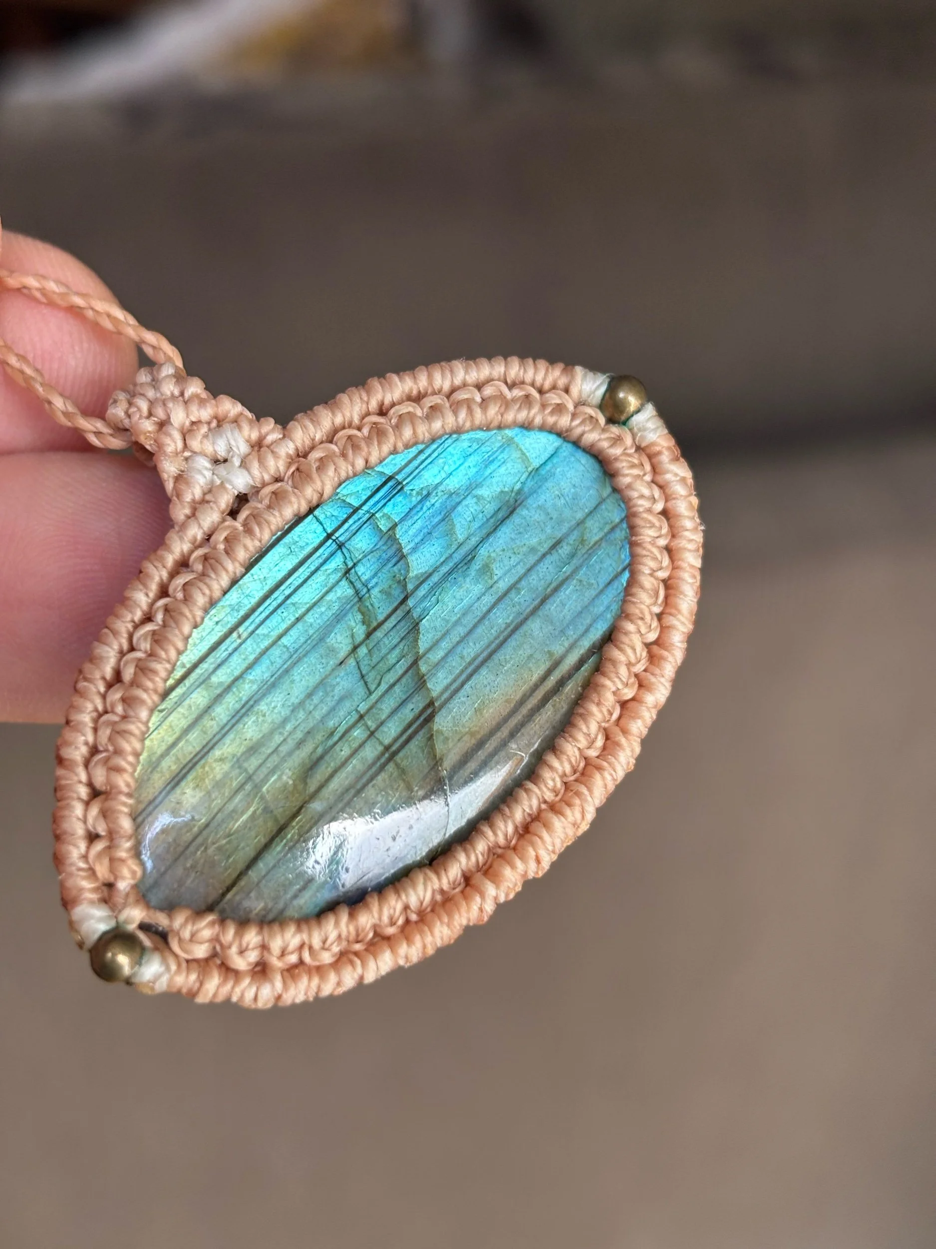 Ce bijou est né au bord de la mer, fil couleur d’écume et de sable, et cette fabuleuse labradorite irisée… murmurait les secrets des océans à mon oreille… je me suis laissée guider…