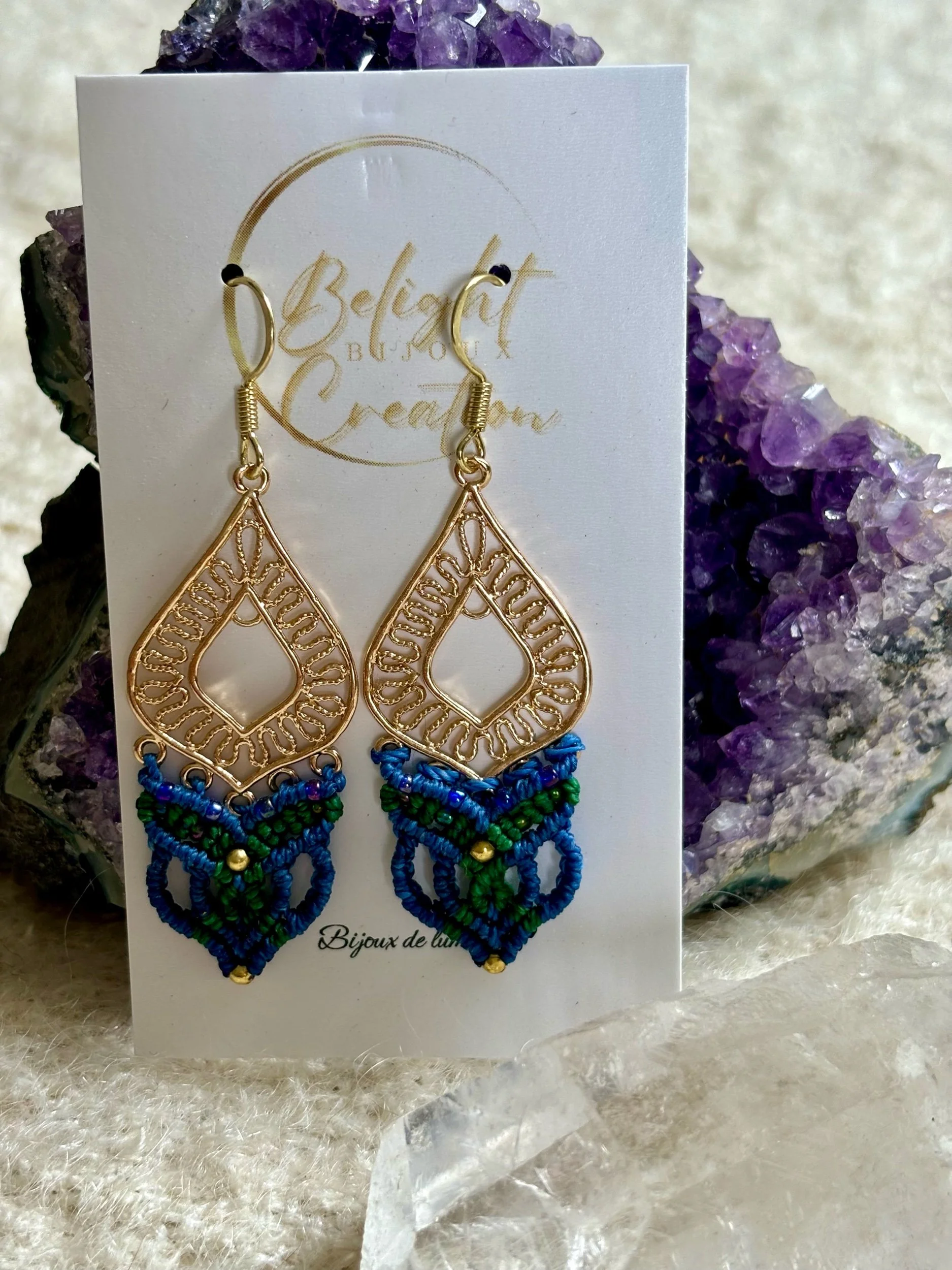 Lumineuses boucles d’oreilles bleues et or, avec une touche de vert… elles me font penser à la robe d’un paon!